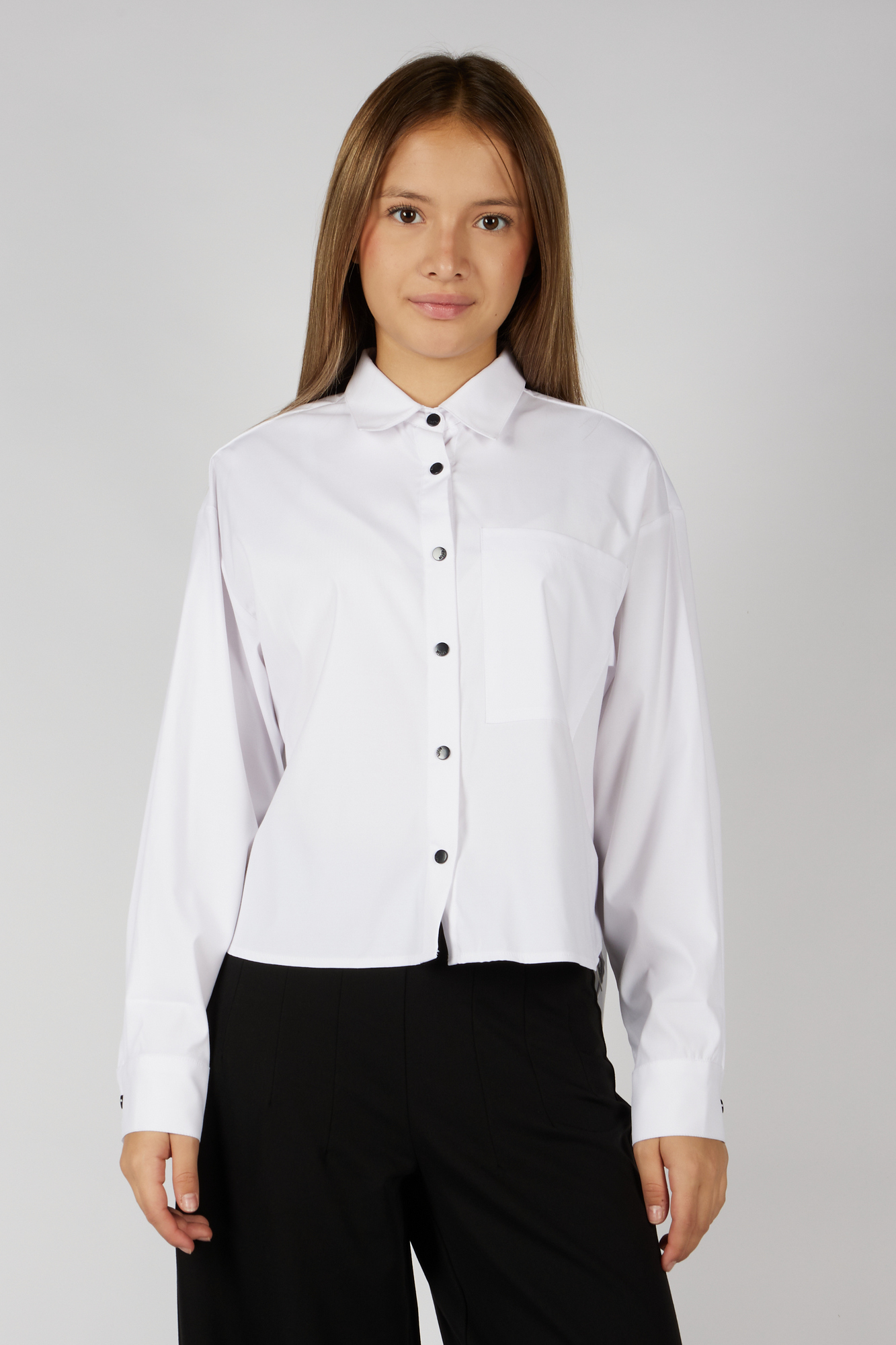 На кнопках. Совместкая ткань из хлопка и бамбука . Легко гладить.